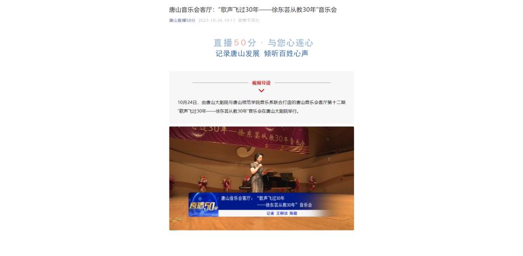10月24日,由唐山大劇院與唐山師范學(xué)院音樂(lè)系聯(lián)合打造的唐山音樂(lè)會(huì)客廳第十二期“歌聲飛過(guò)30年——徐東蕓從教30年”音樂(lè)會(huì)在唐山大劇院舉行。