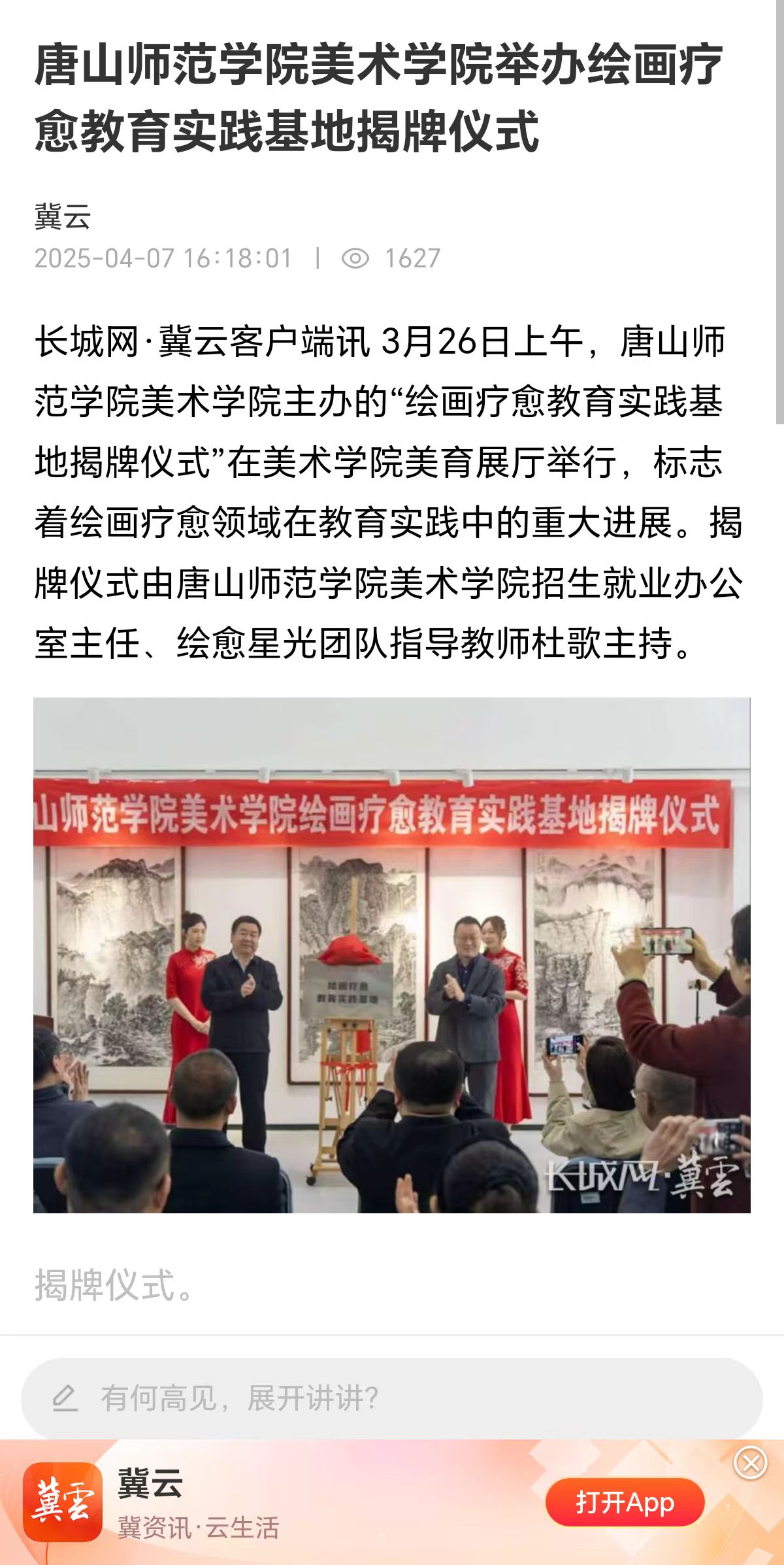 《長(zhǎng)城網(wǎng)》《唐山勞動(dòng)日?qǐng)?bào)》《唐山Plus》——唐山師范學(xué)院美術(shù)學(xué)院舉辦繪畫療愈教育實(shí)踐基地揭牌儀式