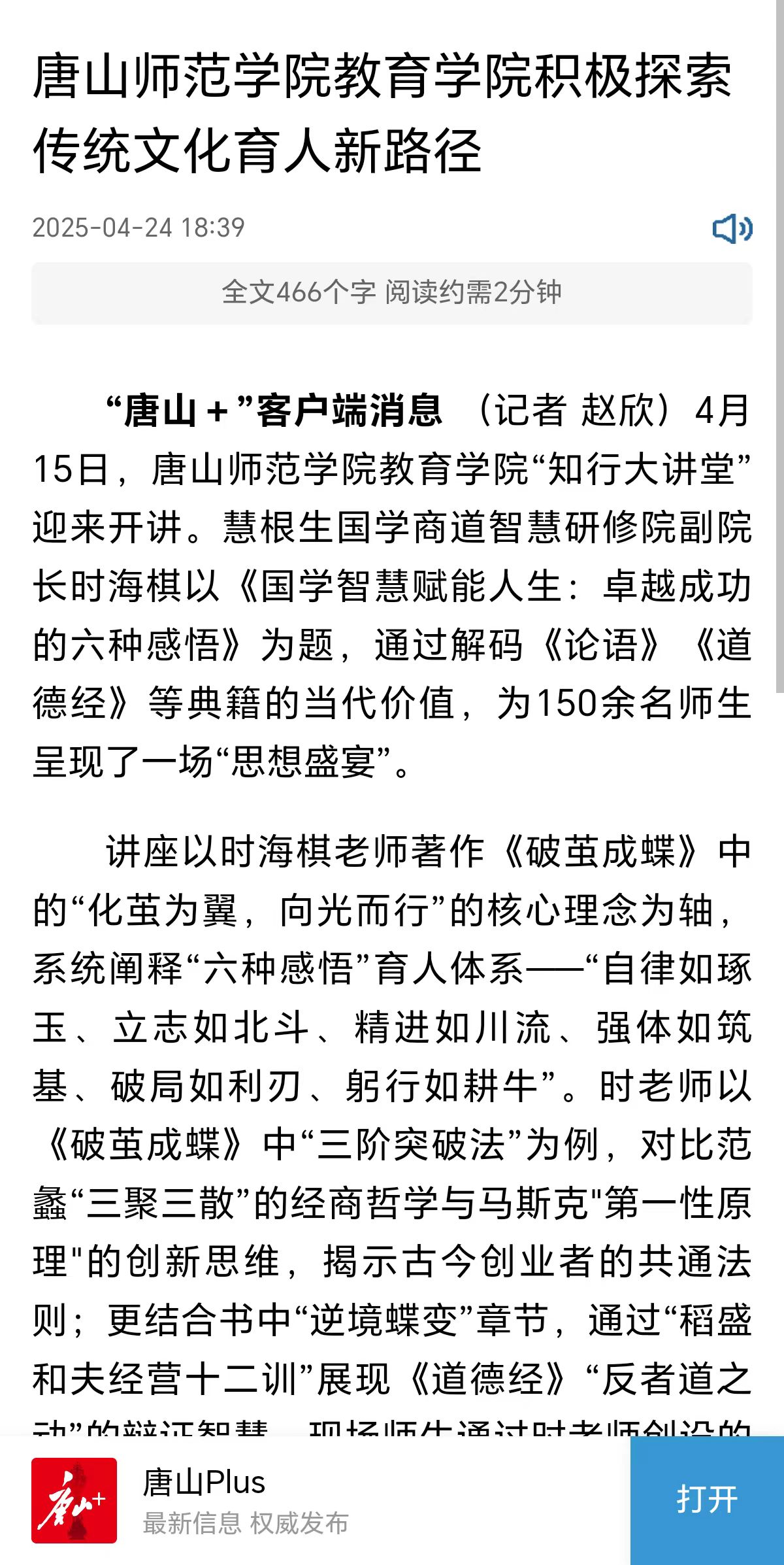4月15日,唐山師范學院教育學院“知行大講堂”迎來開講。慧根生國學商道智慧研修院副院長時海棋以《國學智慧賦能人生:卓越成功的六種感悟》為題,通過解碼《論語》《道德經》等典籍的當代價值,為150余名師生呈現了一場“思想盛宴”。
