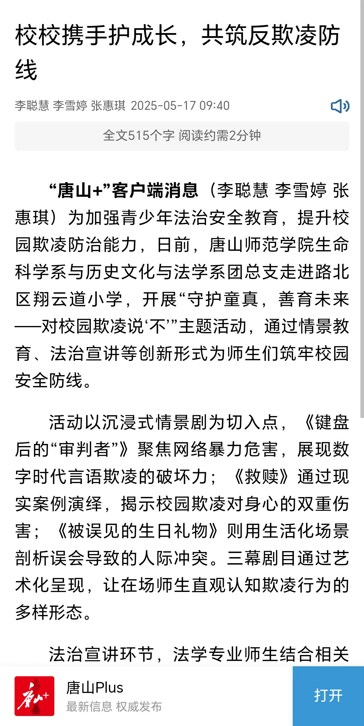 《環渤海新聞網》《唐山Plus》——校校攜手護成長,共筑反欺凌防線
