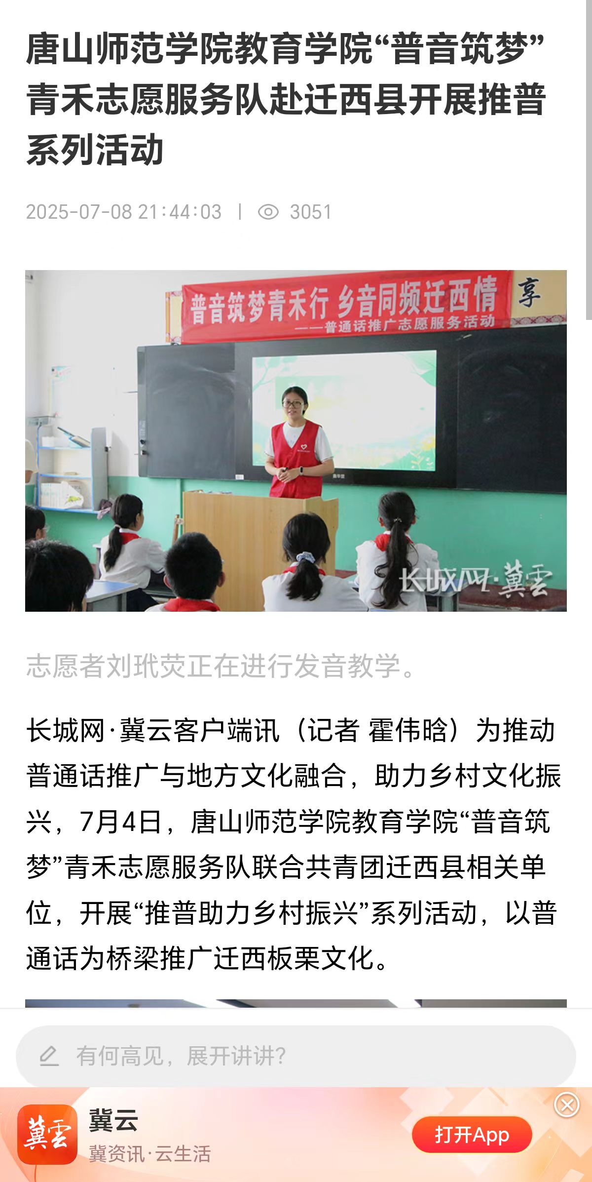 為推動普通話推廣與地方文化融合,助力鄉村文化振興,7月4日,唐山師范學院教育學院“普音筑夢”青禾志愿服務隊聯合共青團遷西縣相關單位,開展“推普助力鄉村振興”系列活動,以普通話為橋梁推廣遷西板栗文化。