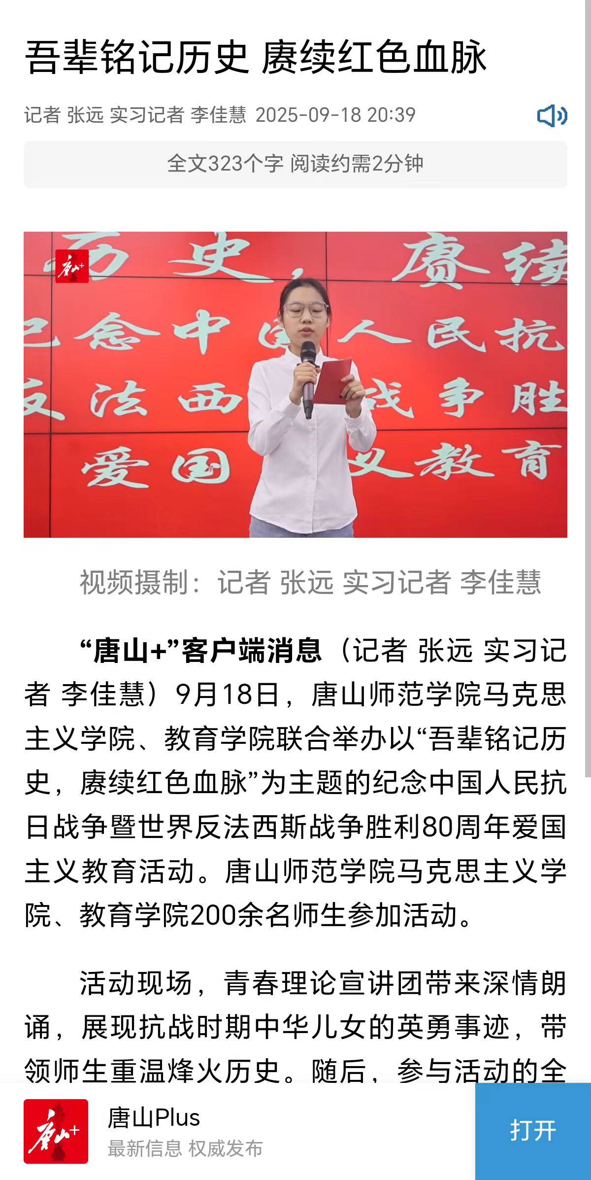 9月18日,唐山師范學(xué)院馬克思主義學(xué)院、教育學(xué)院聯(lián)合舉辦以“吾輩銘記歷史,賡續(xù)紅色血脈”為主題的紀(jì)念中國人民抗日戰(zhàn)爭(zhēng)暨世界反法西斯戰(zhàn)爭(zhēng)勝利80周年愛國主義教育活動(dòng)。