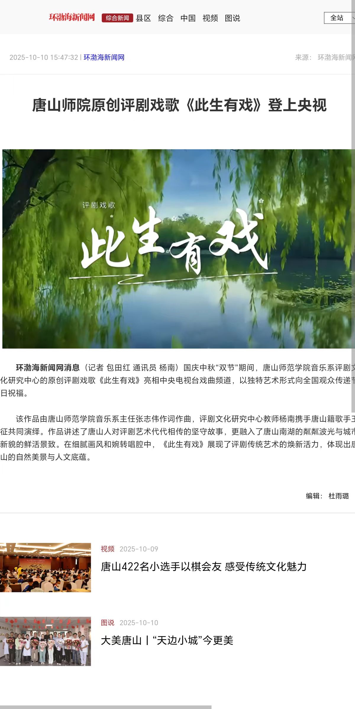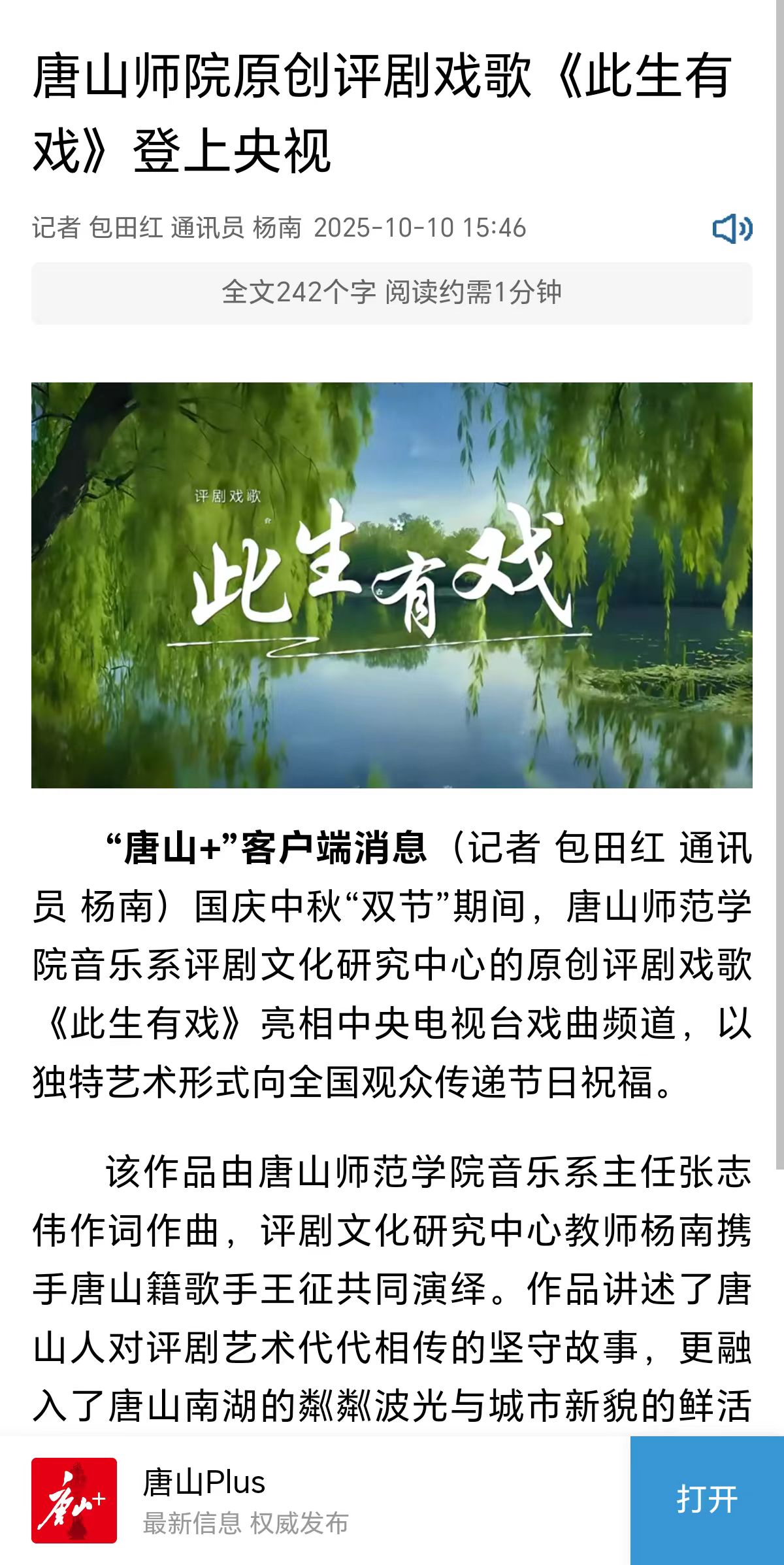 《央視影音》《環渤海新聞網》《唐山Plus》——唐山師范學院原創評劇戲歌《此生有戲》登上央視