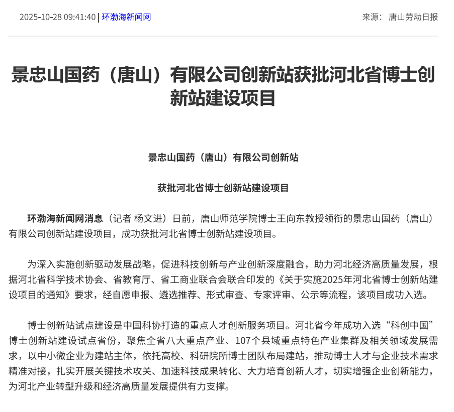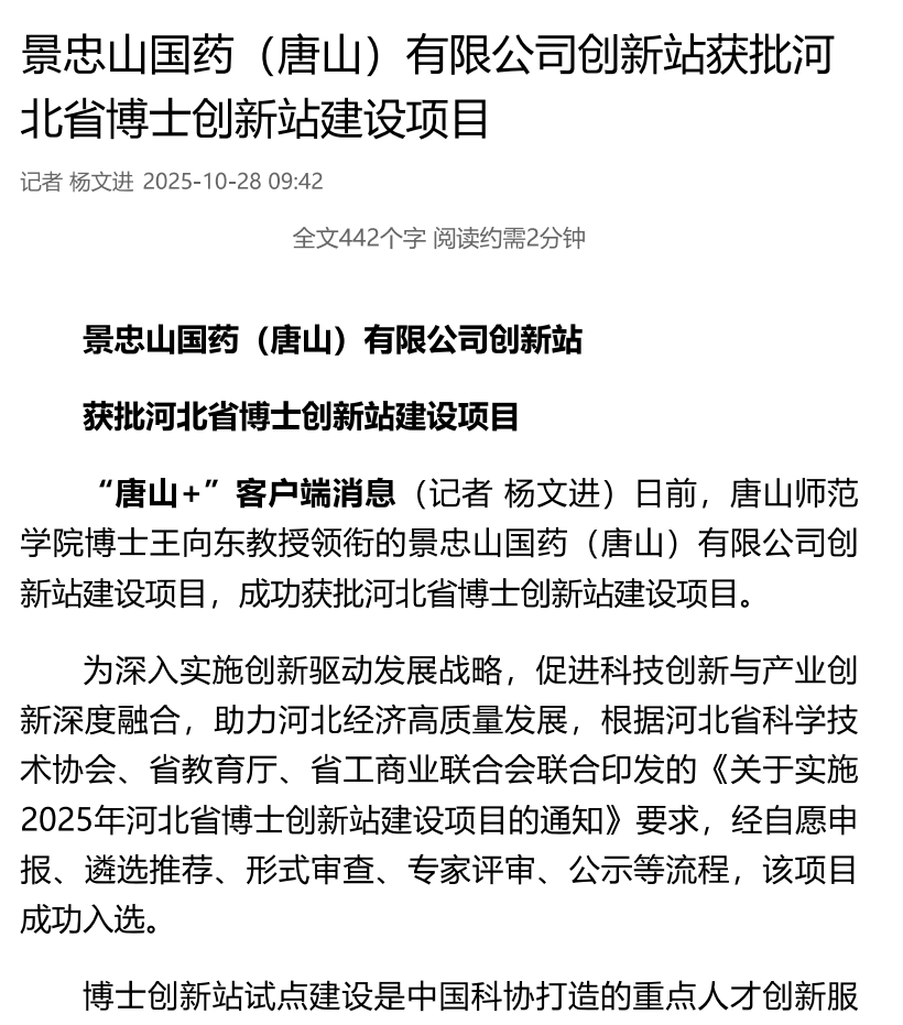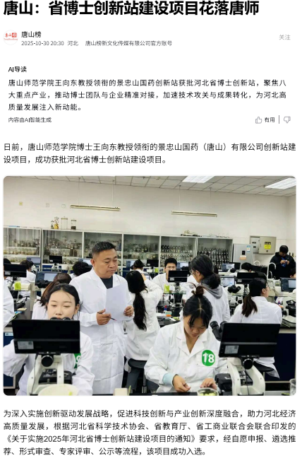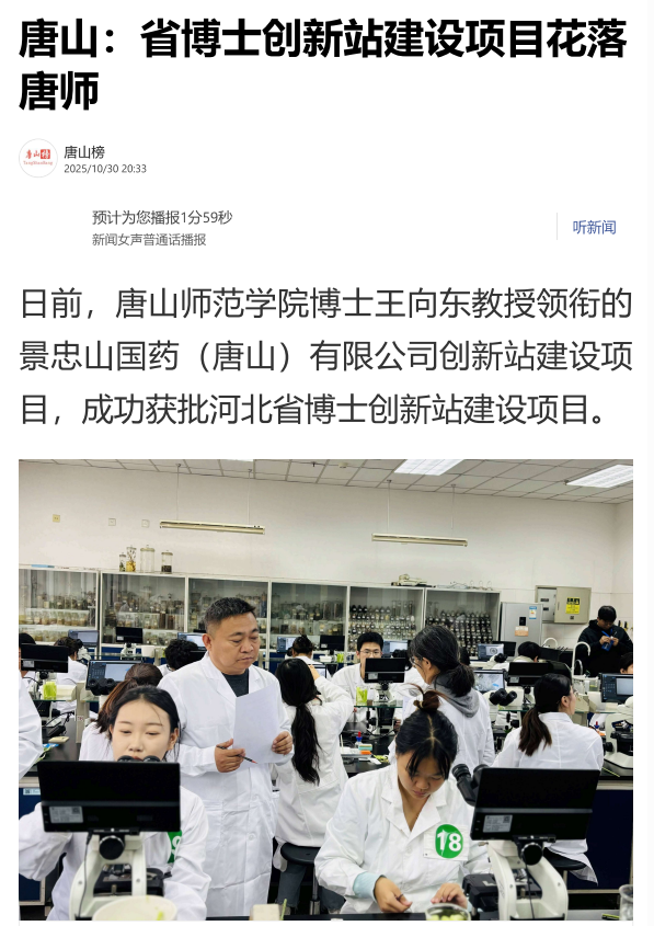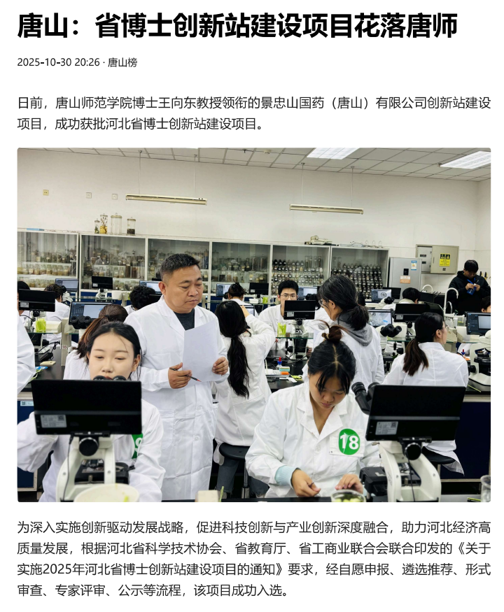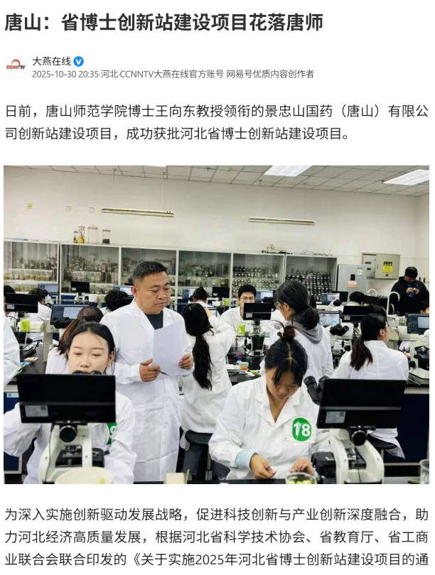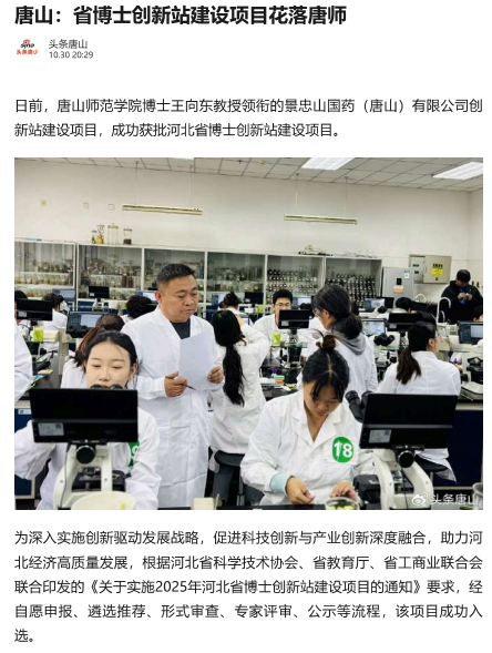 唐山師范學院博士王向東教授領銜的景忠山國藥(唐山)有限公司創新站建設項目,成功獲批河北省博士創新站建設項目。