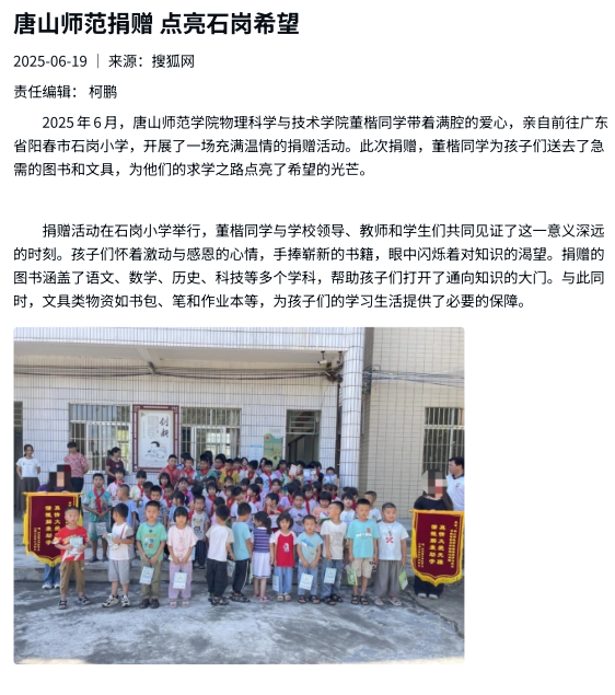 2025年6月,唐山師范學院物理科學與技術學院董楷同學帶著滿腔的愛心,親自前往廣東省陽春市石崗小學,開展了一場充滿溫情的捐贈活動。